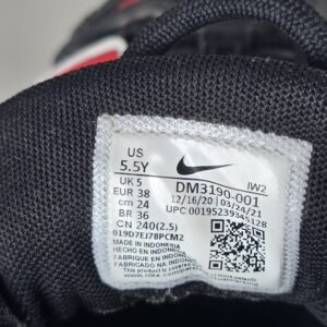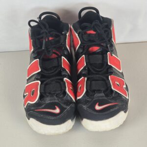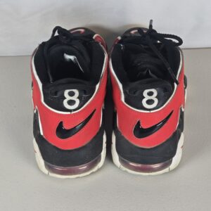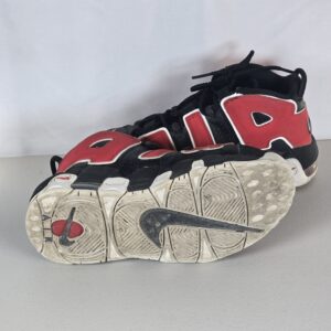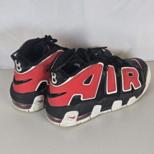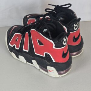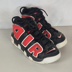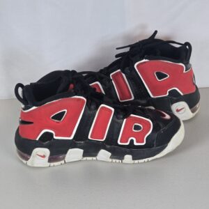 Nike Air More Uptempo sneakers featuring the iconic oversized AIR lettering design. This youth-sized pair comes in a classic black, red, and white colorway with visible Air cushioning for comfort and impact protection.