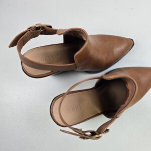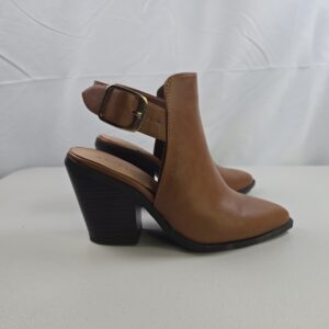 This is a pair of Bamboo brown slingback ankle boots featuring a pointed toe design and a chunky block heel. A versatile style suitable for everyday wear or casual dress outfits.