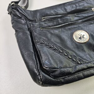 This is a Beverly Hills Polo Club black shoulder crossbody bag featuring a classic everyday design. The bag includes multiple front zip pockets, braided trim detailing, and an adjustable shoulder strap.