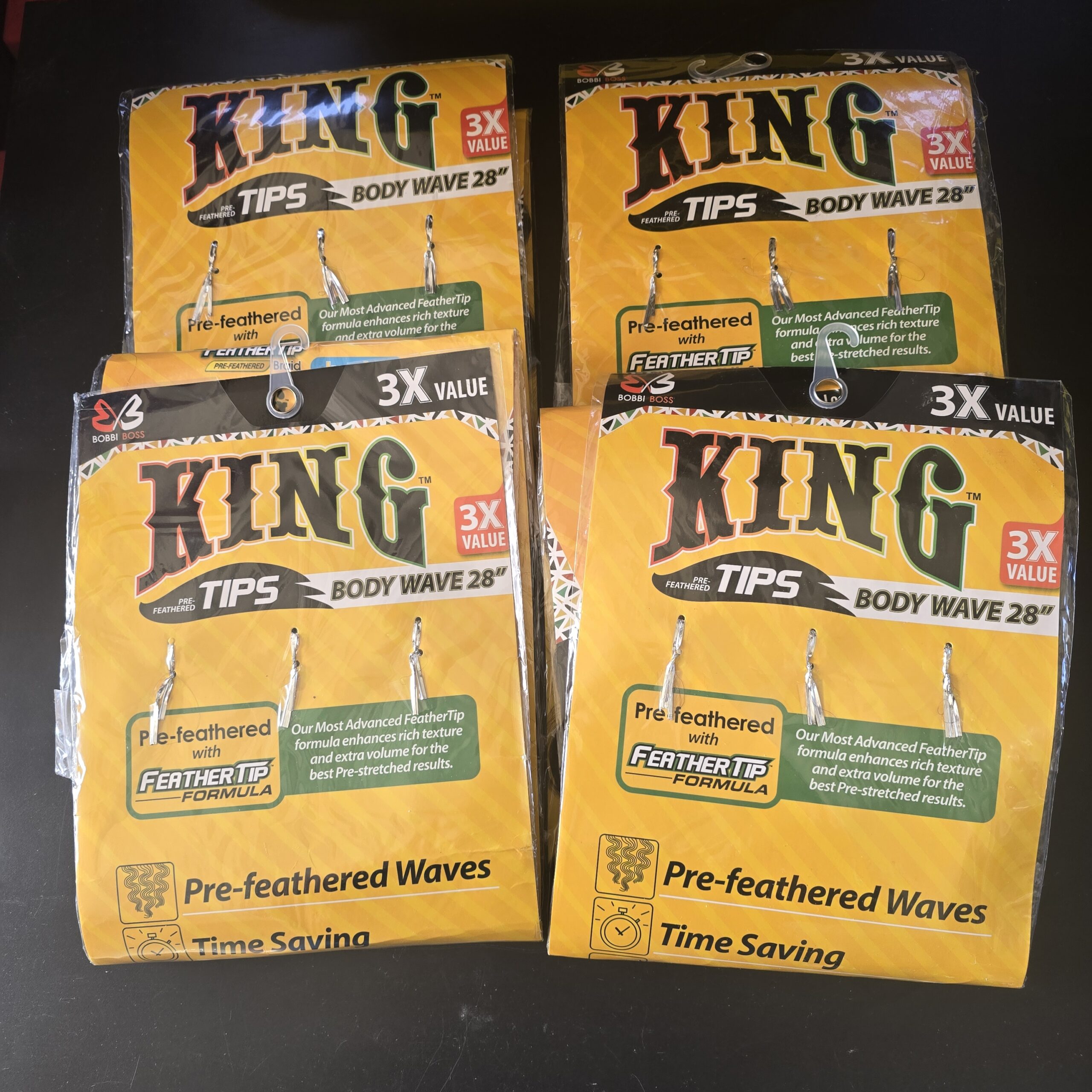 The Bobbi Boss King Tips Body Wave 28″ hair extensions are designed for braid and weave styling, offering a pre-feathered body wave texture for added volume and convenience. This style is commonly used for achieving long, textured looks with less preparation time.