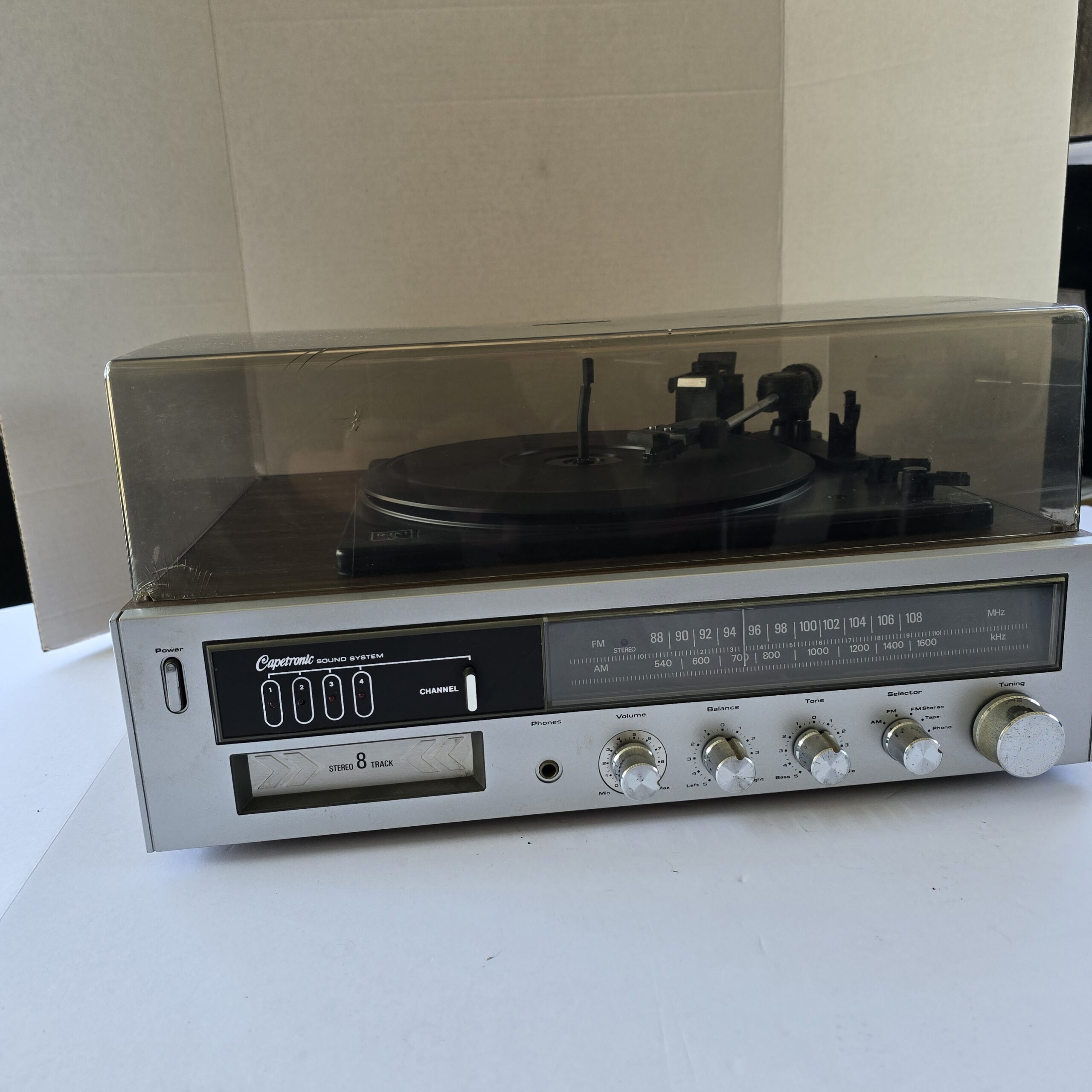 Overview:- Bring vintage audio charm into your space with the Capetronic Sound System Stereo Console, a retro all-in-one unit that combines FM/AM radio, an 8-track player, and a classic record player.- Ideal for collectors and vintage audio enthusiasts, this piece offers a nostalgic throwback to the audio systems of the 1970s and 1980s.Key Features:- FM/AM manual dial radio tuner- Integrated stereo 8-track player- Built-in record player with plastic dust cover- Classic design featuring silver, black, and faux wood grain finishes- Vintage construction using plastic, metal, and faux wood panelingCondition:- Good used condition- Minor surface scratches on the dust cover- Knobs show wear and slight discoloration or oxidation- Electronics are untestedIncluded:- Main stereo unit with built-in 8-track, tuner, and record player- Original plastic dust coverNotes:- Authentic vintage piece, likely from the 1970s or 1980s- Recommended to test functionality before resale- Great display item or restoration project for retro audio fans- Highlighting retro appeal and working features in photos may increase resale value