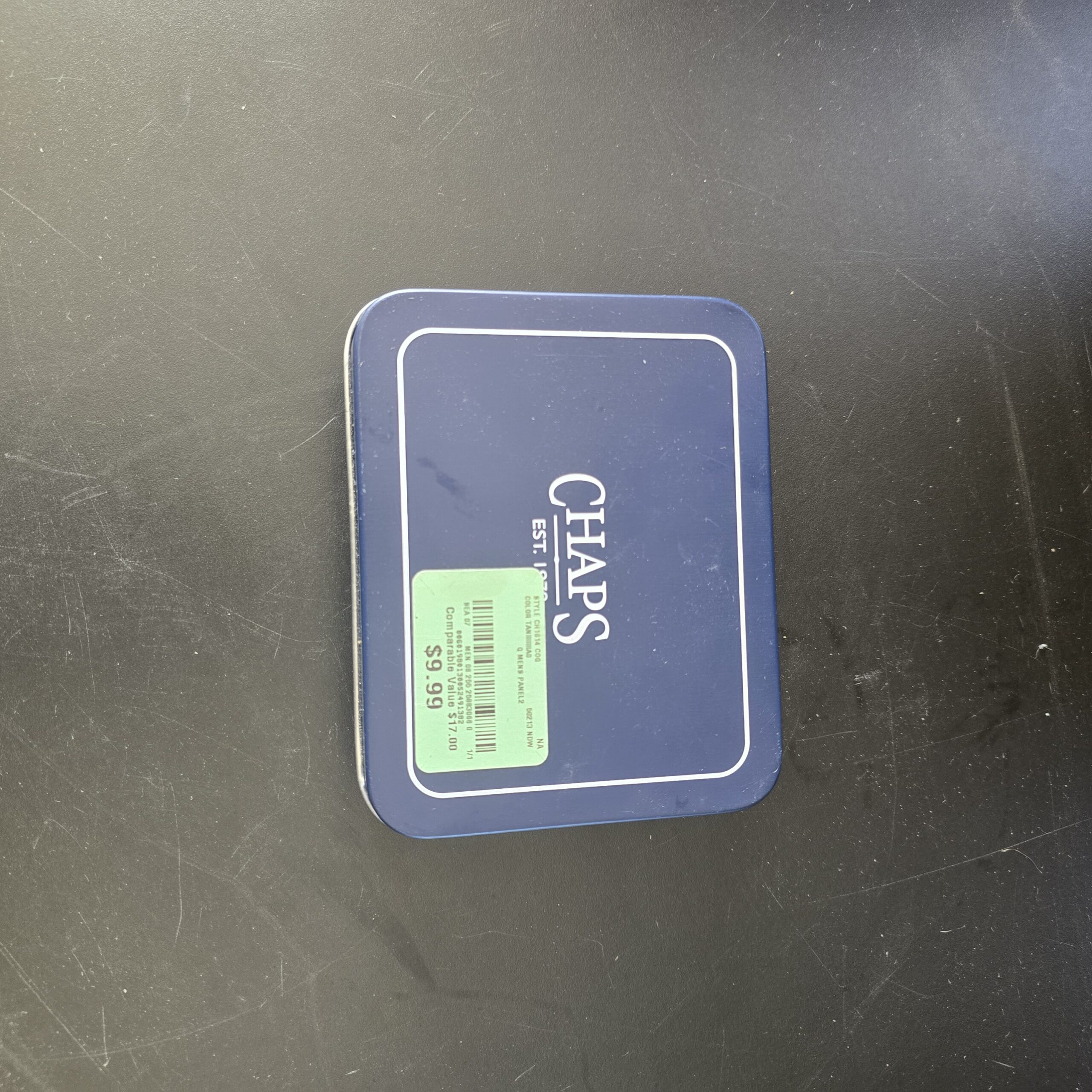 This Chaps gift set tin is a metal container commonly used for packaging men’s fragrance sets. It is designed for holding grooming or cologne items in a presentable format.