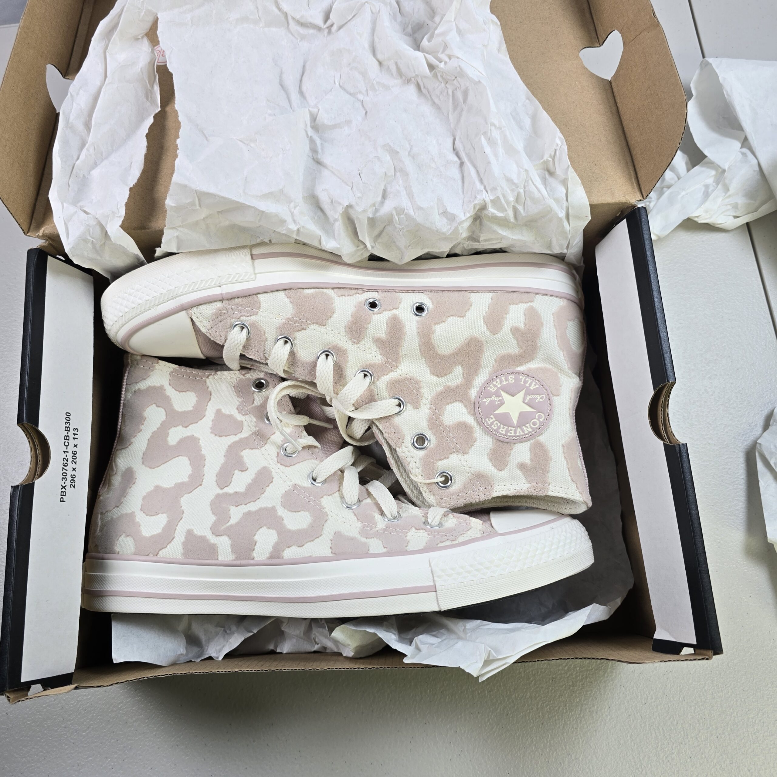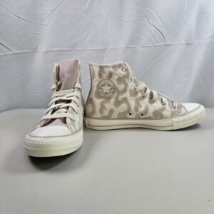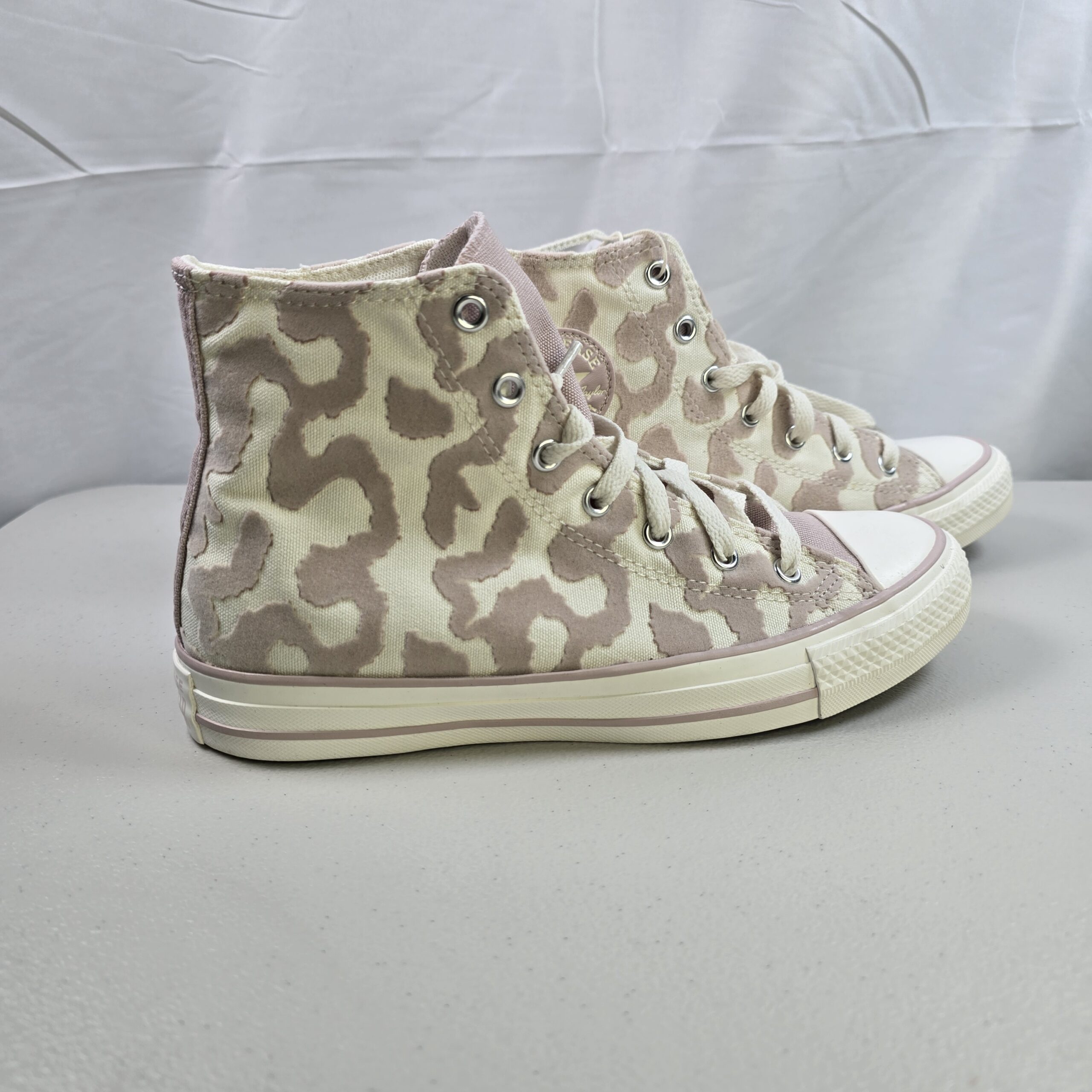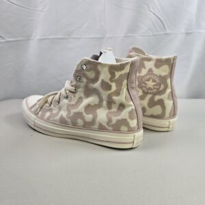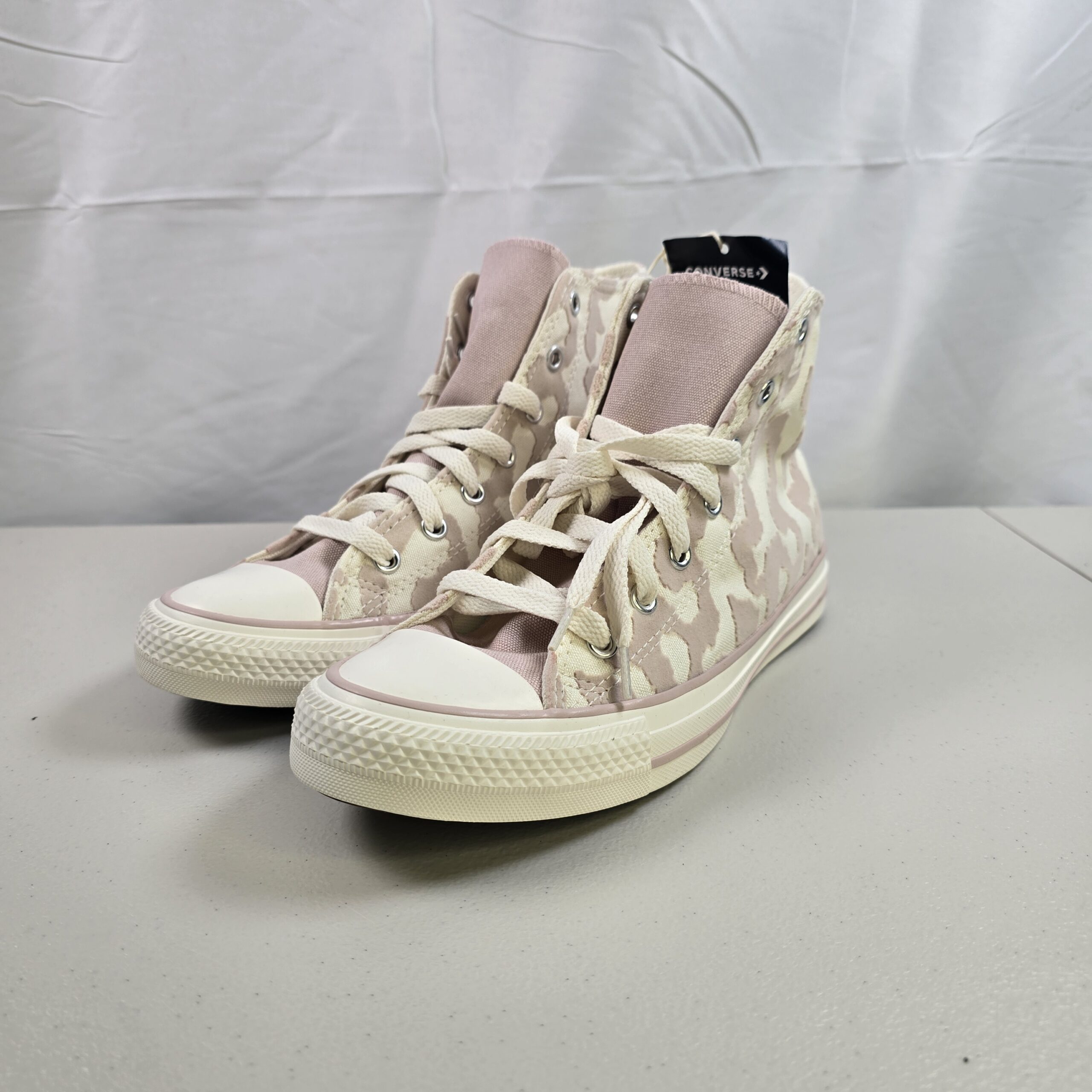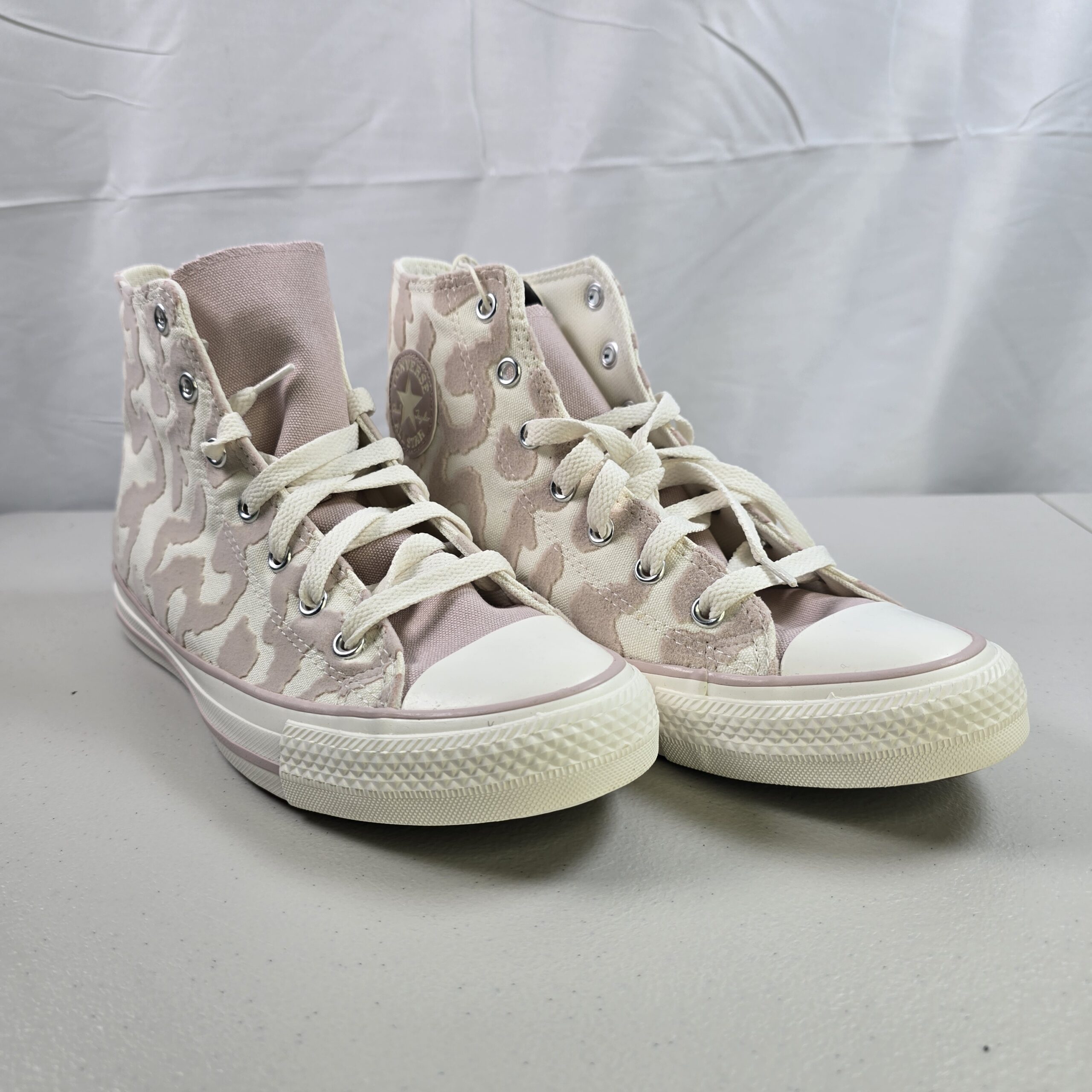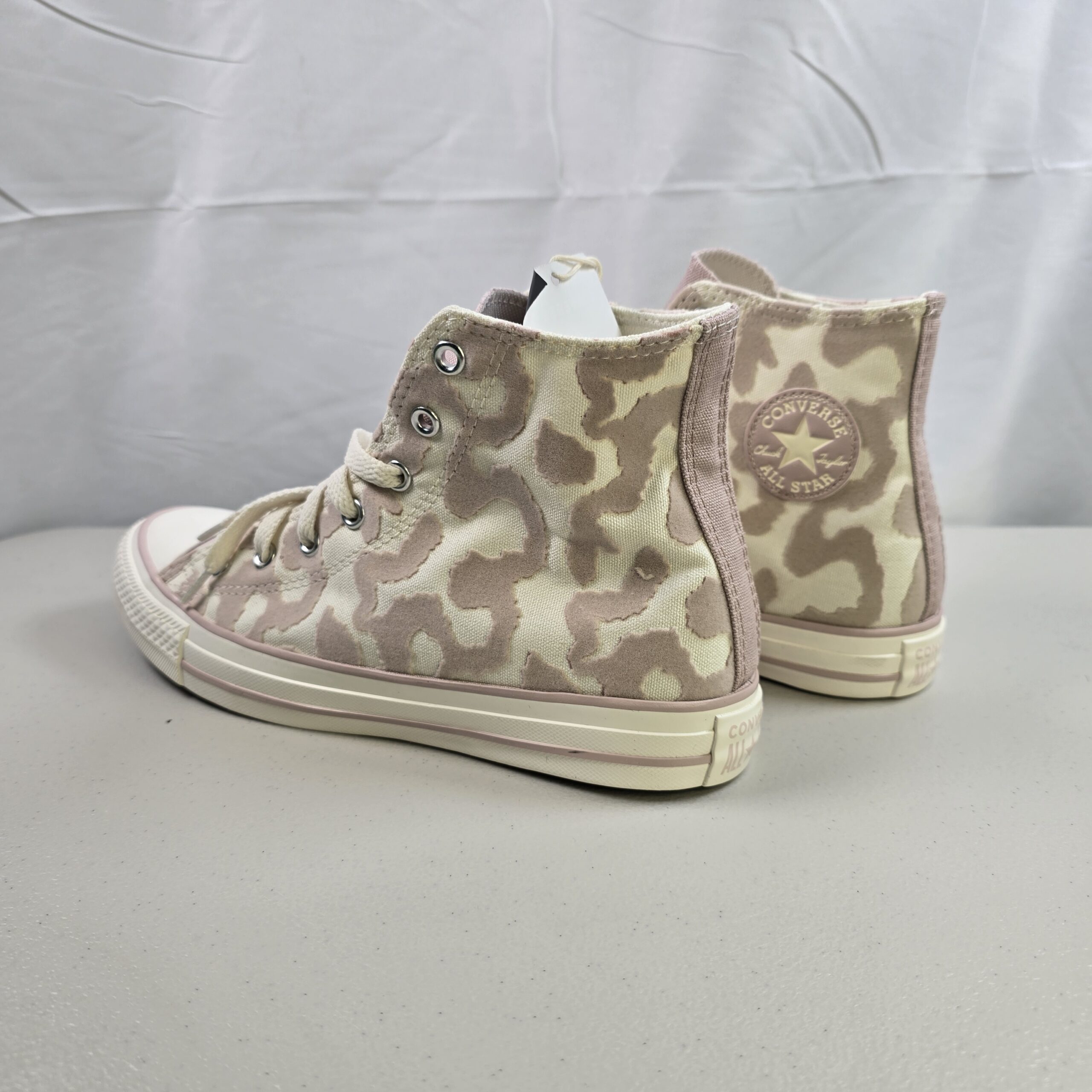 Brand new Converse Chuck Taylor All Star Hi sneakers featuring a camo-pattern canvas upper in Egret and Flush Stone tones. Classic high-top design with rubber toe cap and vulcanized sole.