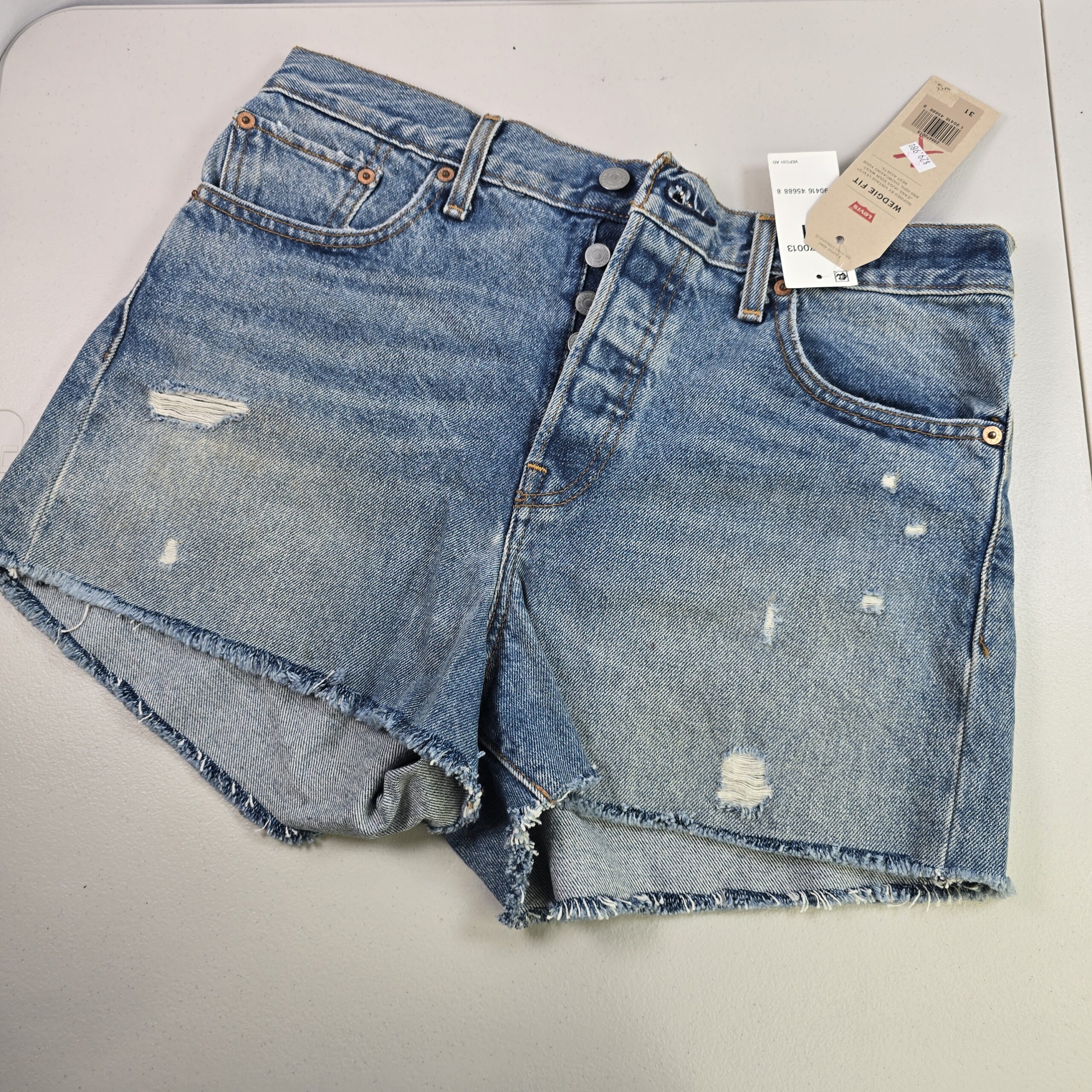 Pre-owned. Distressed areas and frayed hems are part of the original design.