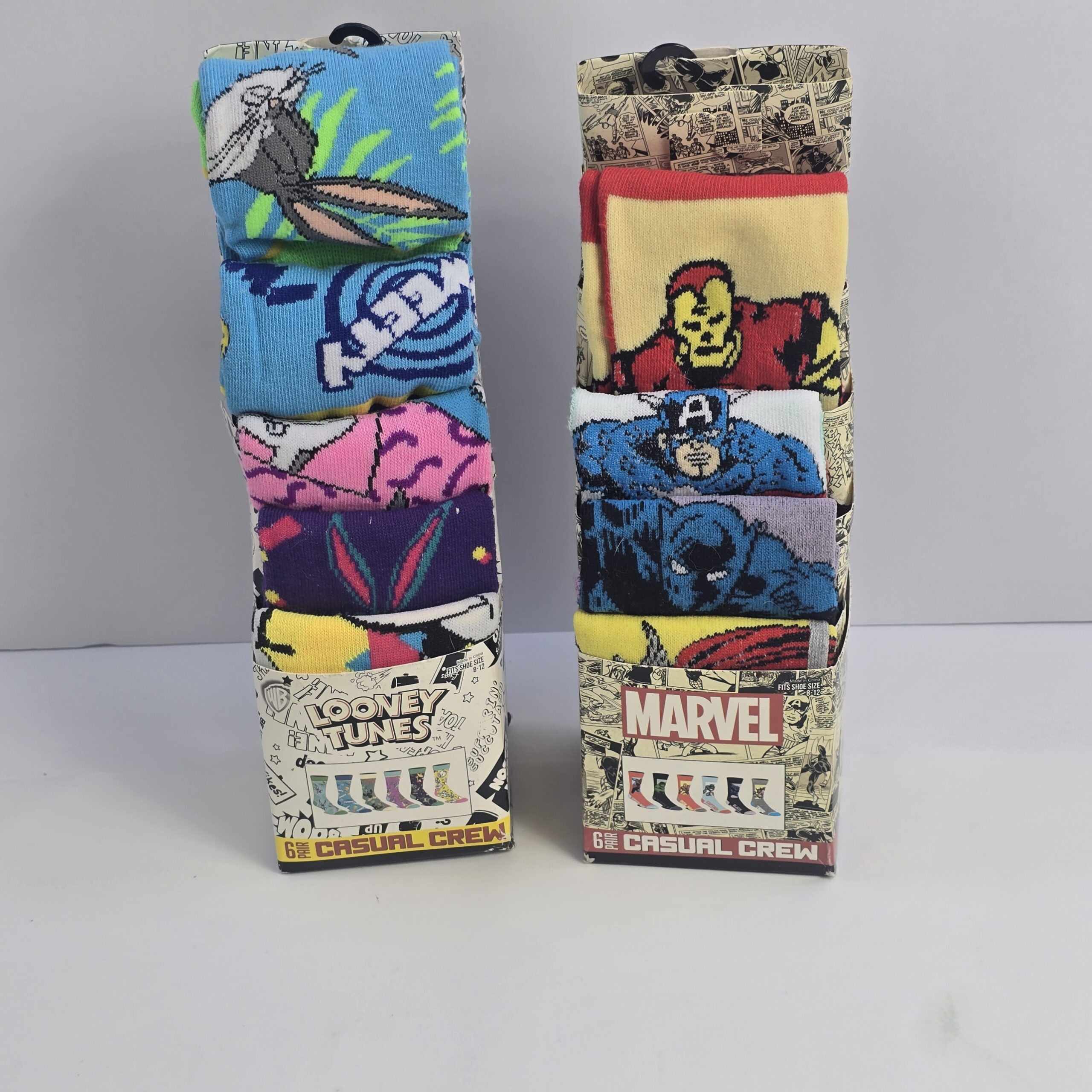 This is a set of casual crew socks designed for everyday wear. Featuring themed designs from Looney Tunes and Marvel, these socks are commonly used for adding character and comfort to daily outfits.