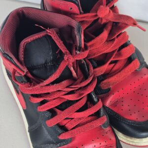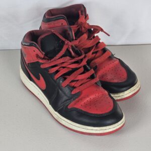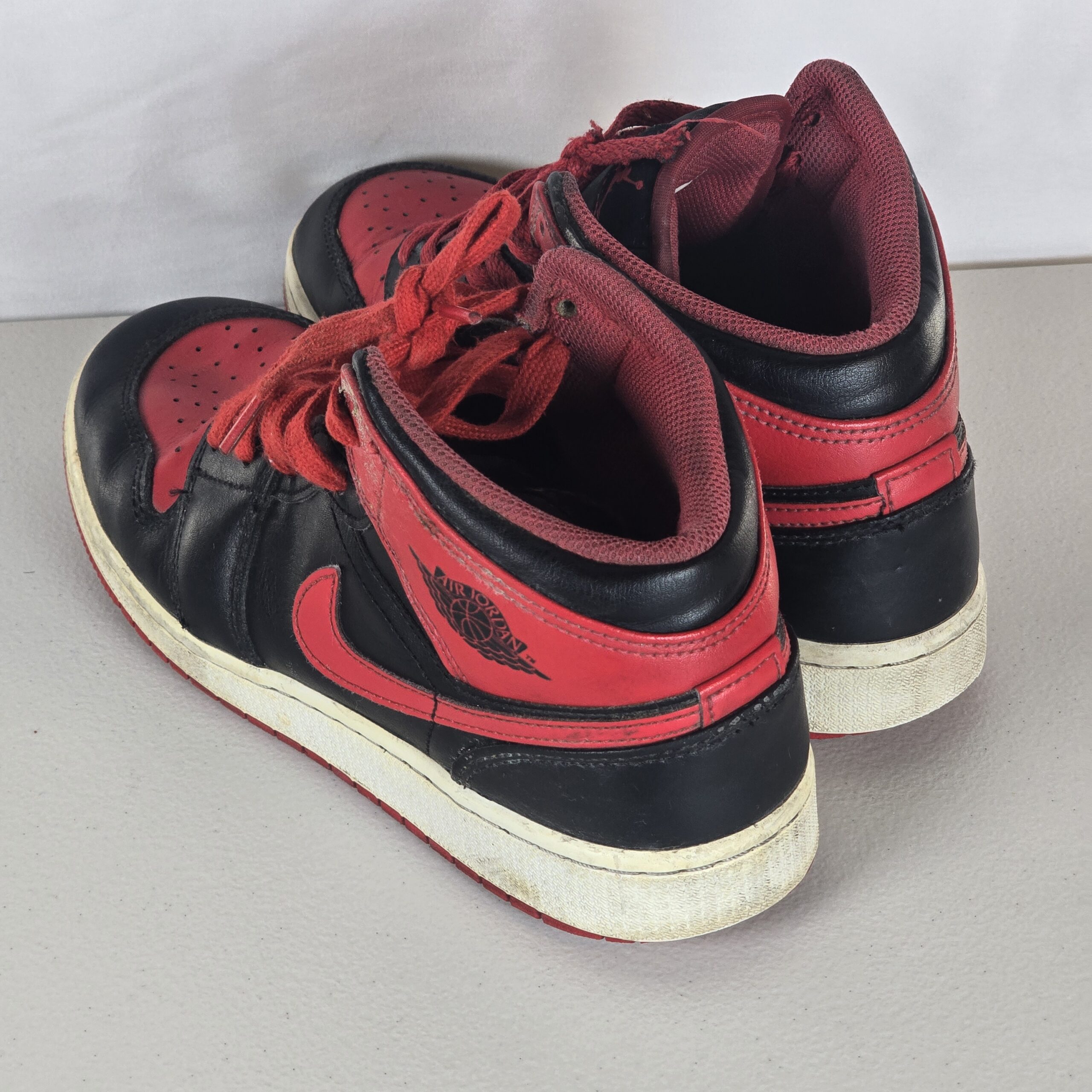 This is a pair of Nike Air Jordan youth mid top sneakers featuring a classic black and red colorway. Designed for kids or youth wear, these sneakers offer a timeless Jordan style suitable for everyday use.
