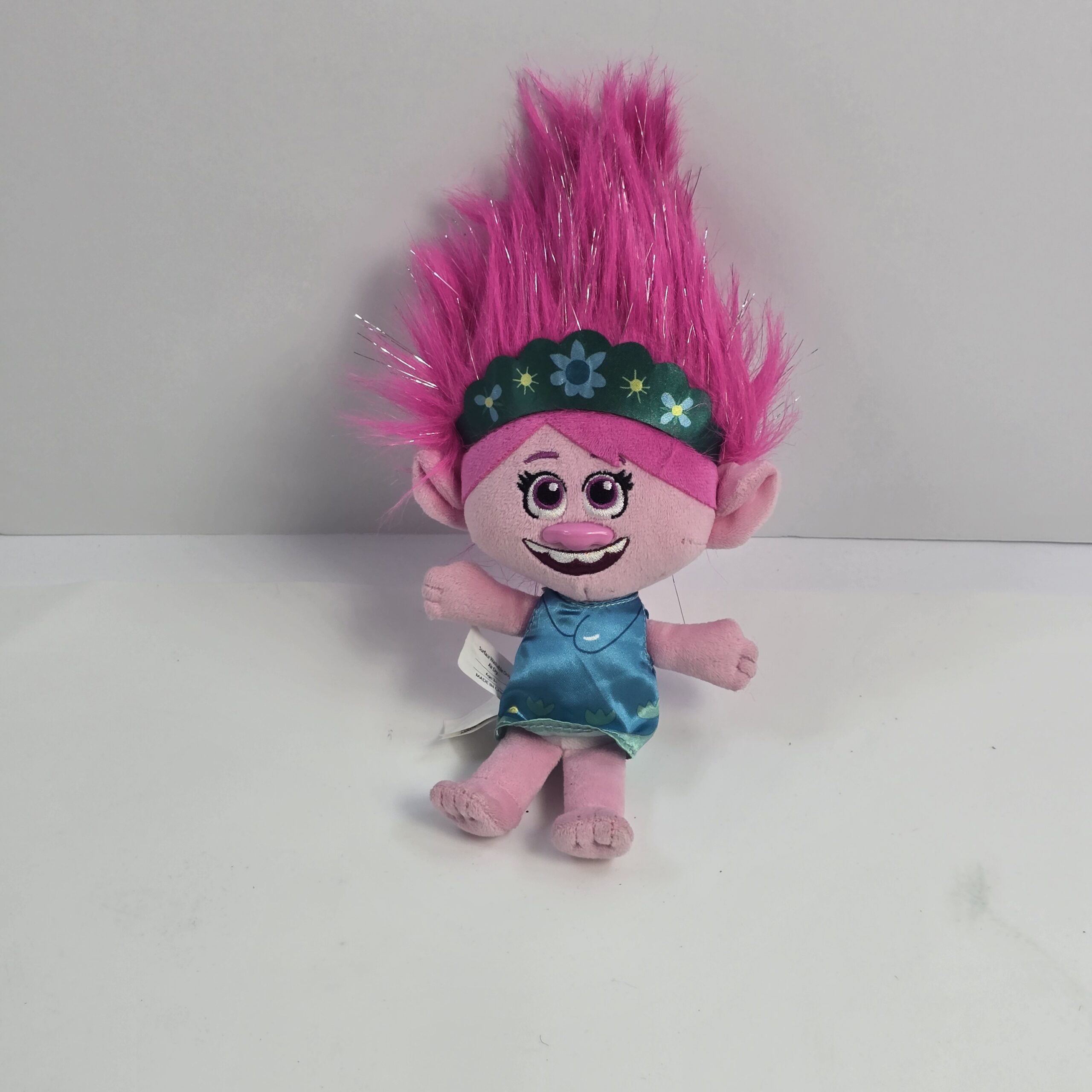 This plush doll with pink hair is designed for imaginative play and is commonly used as a soft toy for children. Its colorful design may appeal to fans of fantasy or character-themed toys.