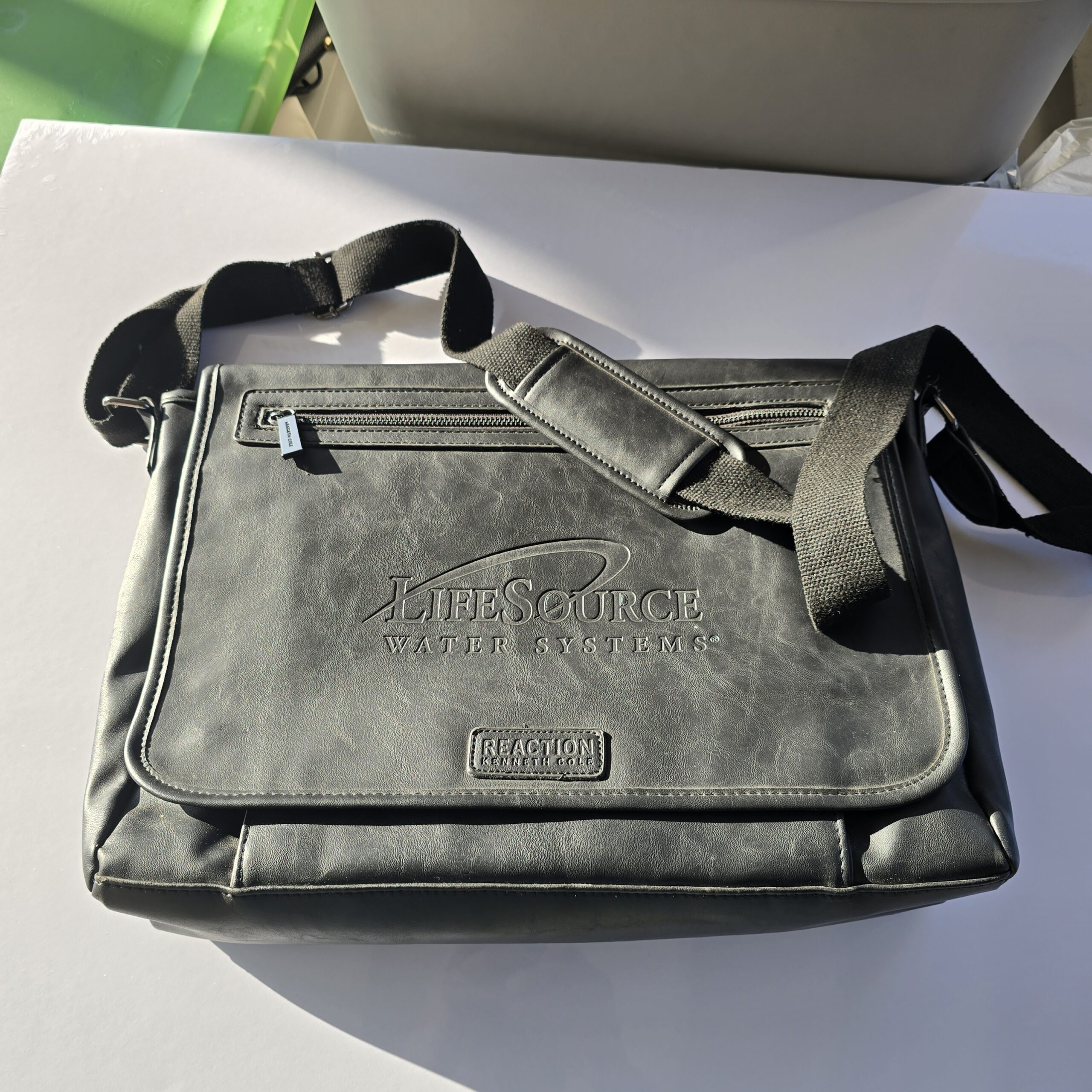 Overview:- This Reaction Kenneth Cole messenger bag offers a stylish and professional look, crafted from durable faux leather in a dark gray/charcoal finish. Ideal for casual business or conference use, it combines function with sleek design.Key Features:- Premium faux leather (synthetic material) exterior- Adjustable shoulder strap for comfort and versatility- Flap closure for added security- Exterior zippered pocket for quick-access items- Embroidered logos of Reaction Kenneth Cole and LifeSource Water SystemsCondition:- Very Good condition- Gently used with no major visible damage or stains- Minor creasing on material; no significant wearIncluded:- No additional items includedNotes:- Unique co-branded promotional item with logos from both Kenneth Cole Reaction and LifeSource Water Systems- Market value may vary due to its custom promotional nature