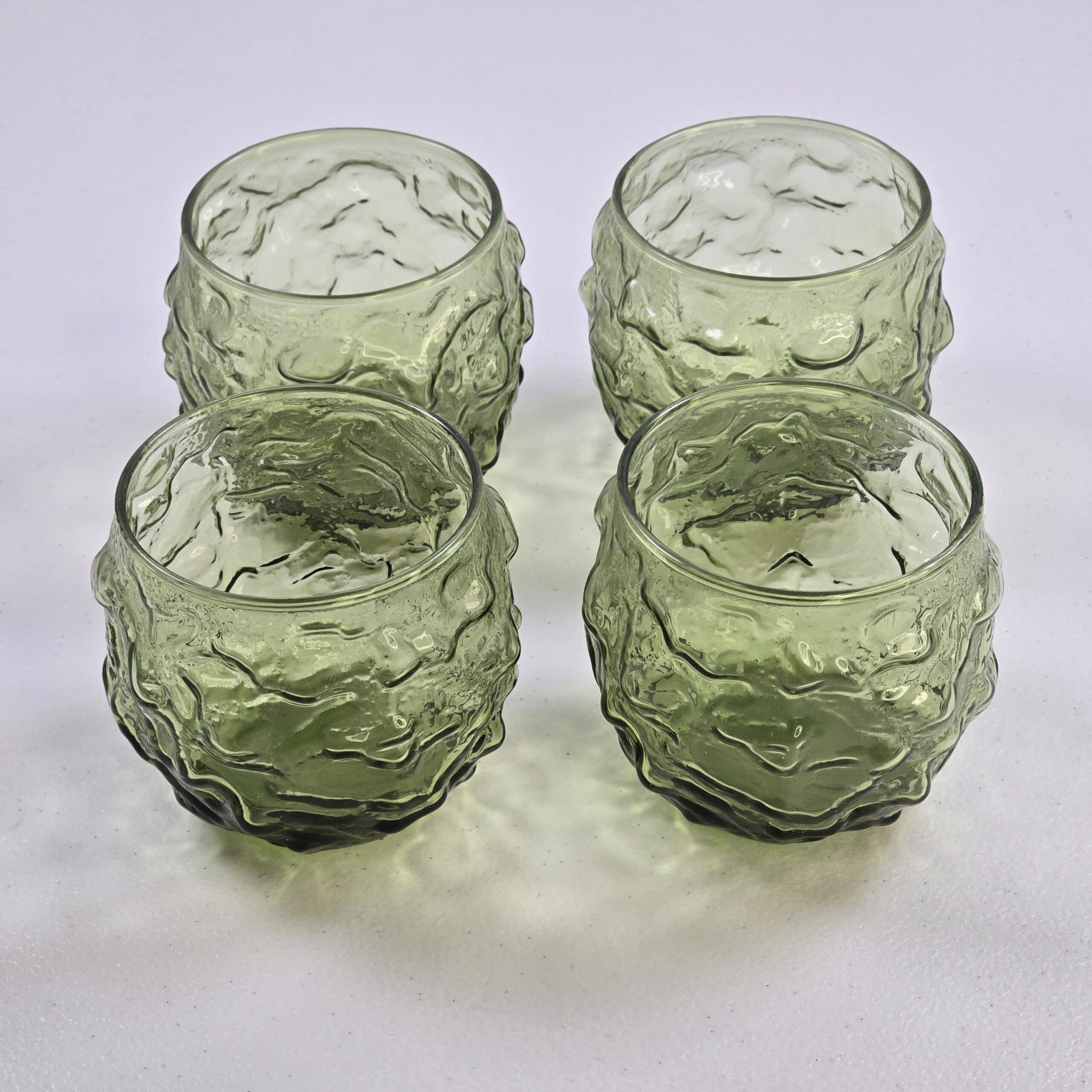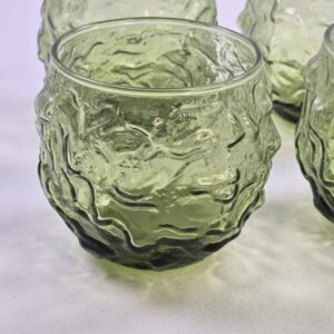 This vintage green pressed glass tumbler set features a textured, organic-style surface with a thick base. These low-profile glasses are suitable for serving water, juice, or spirits, and also work well as decorative vintage drinkware.