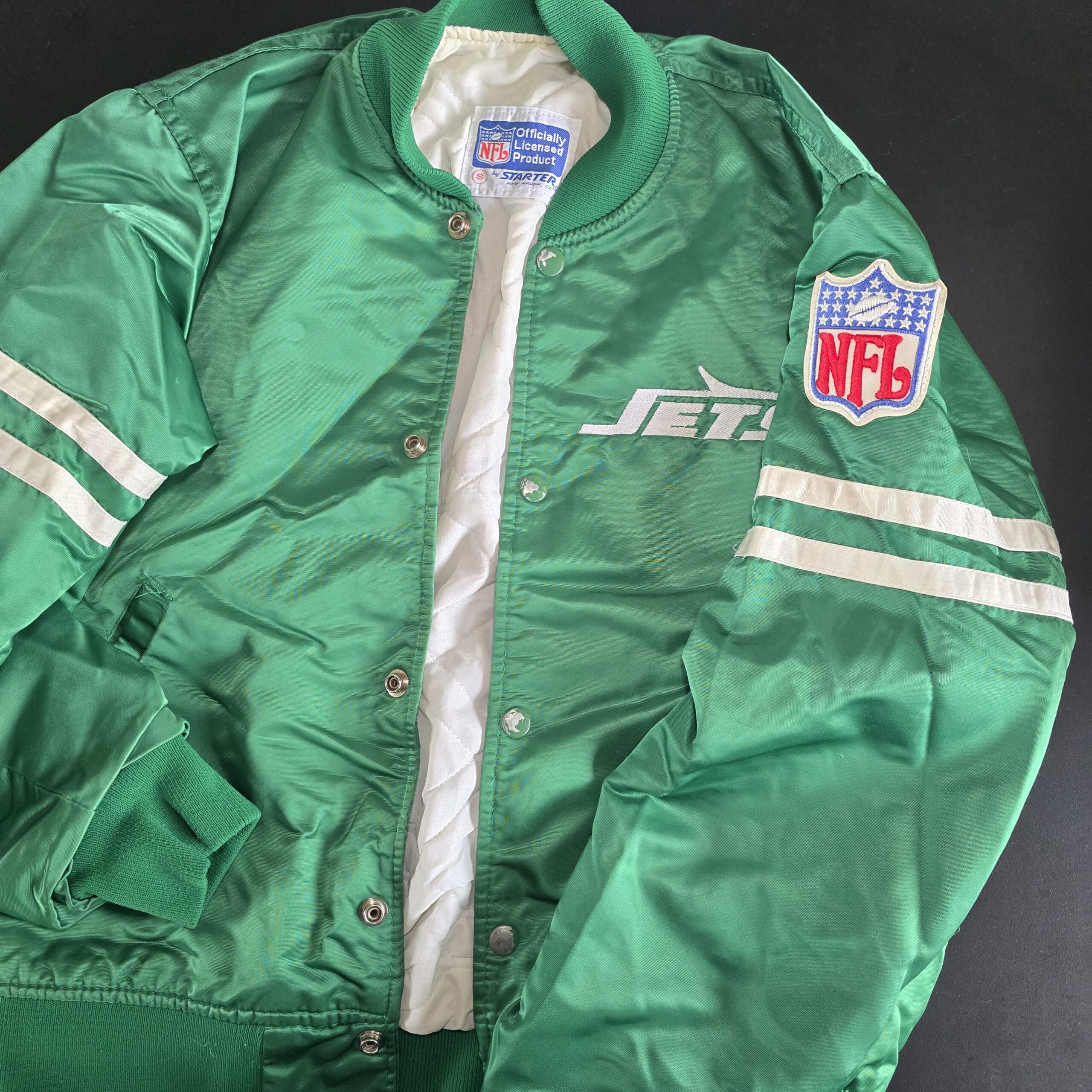 Vintage NFL satin bomber jacket by Starter, officially licensed and featuring New York Jets team branding. Classic stadium jacket design with a quilted lining and snap-button front.