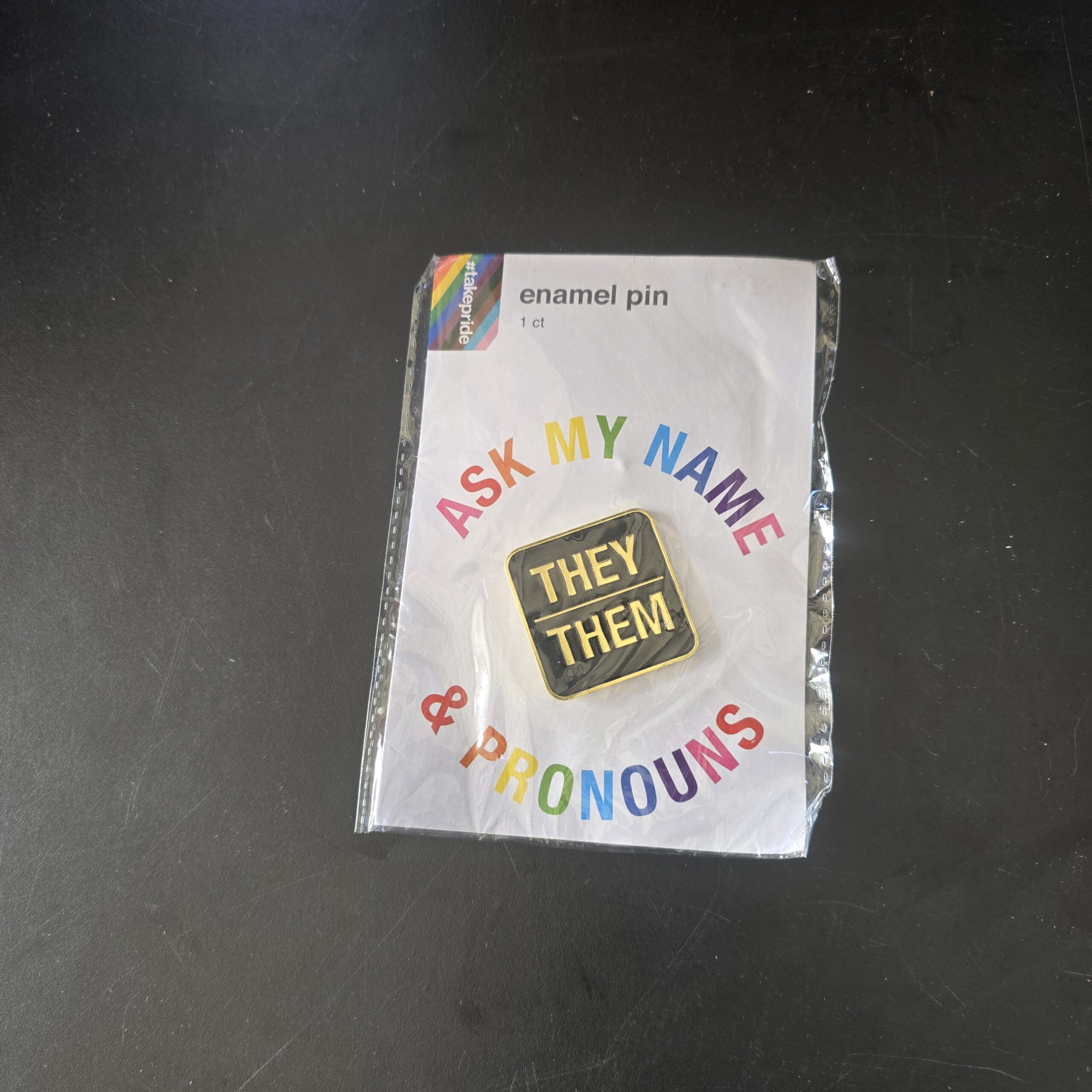 - Visible Text: ASK MY NAME & PRONOUNS, THEY THEM, enamel pin, 1 ct, #takepride