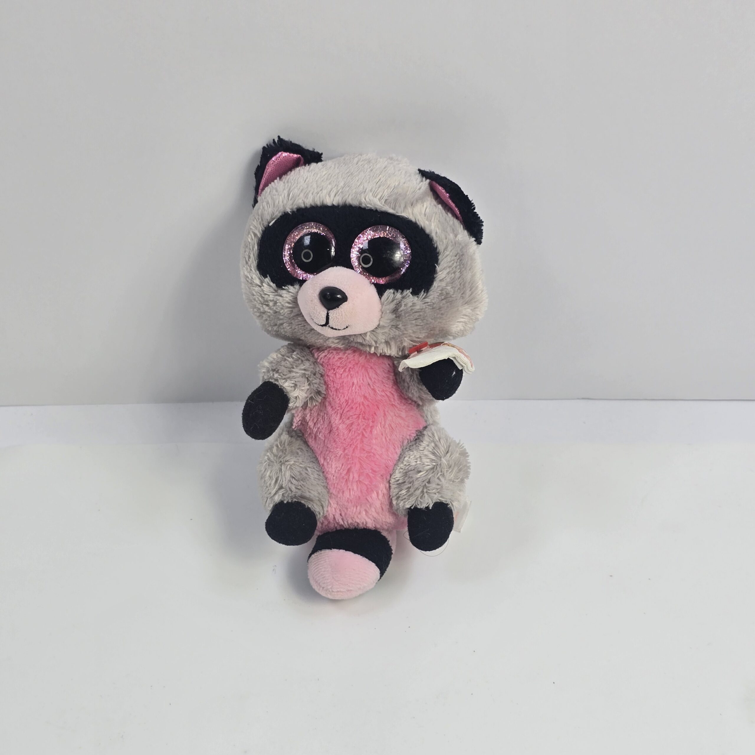 This plush raccoon toy is designed for play or display and is commonly used as a collectible or comfort item. It features a soft body with a distinct eye style that may align with recognizable plush lines.
