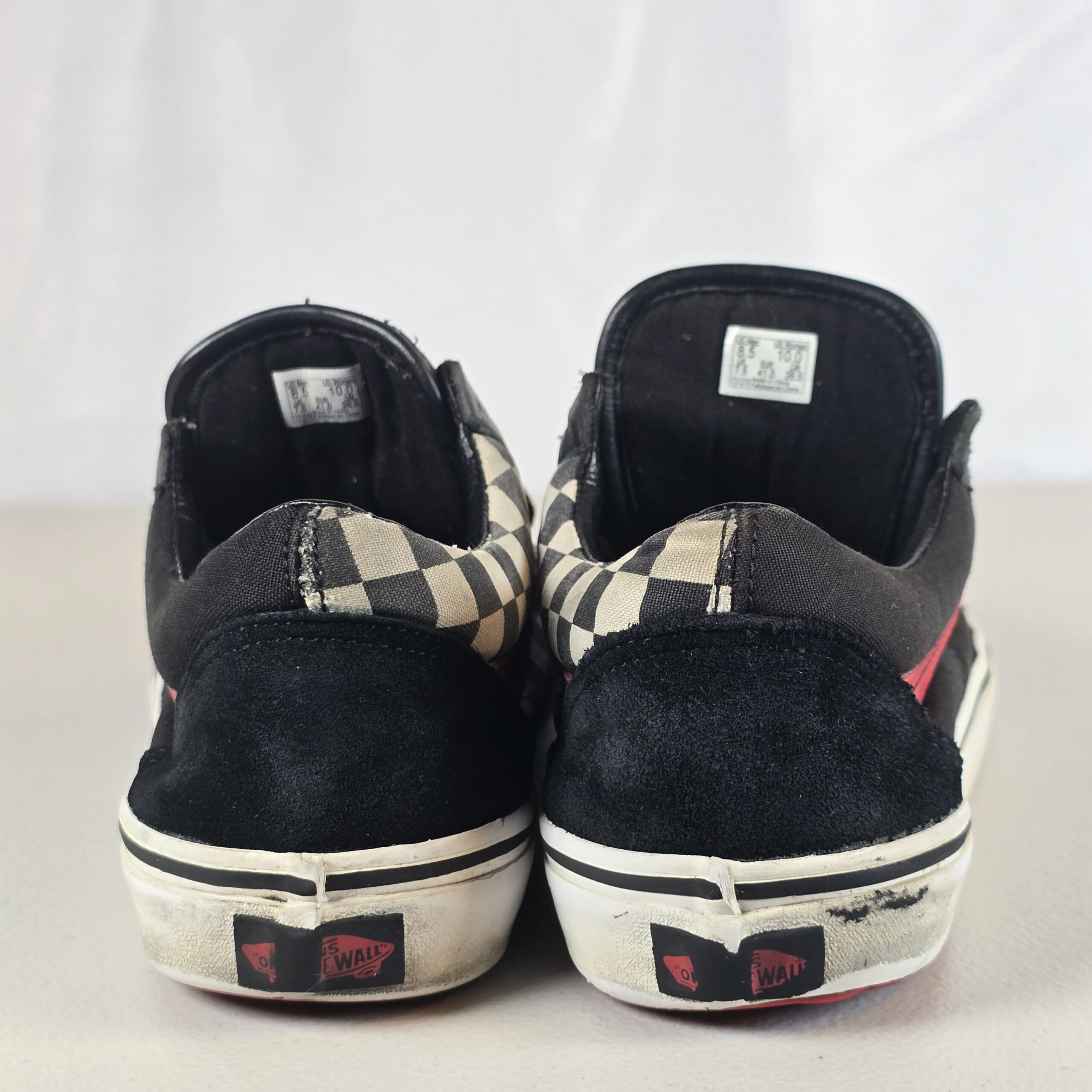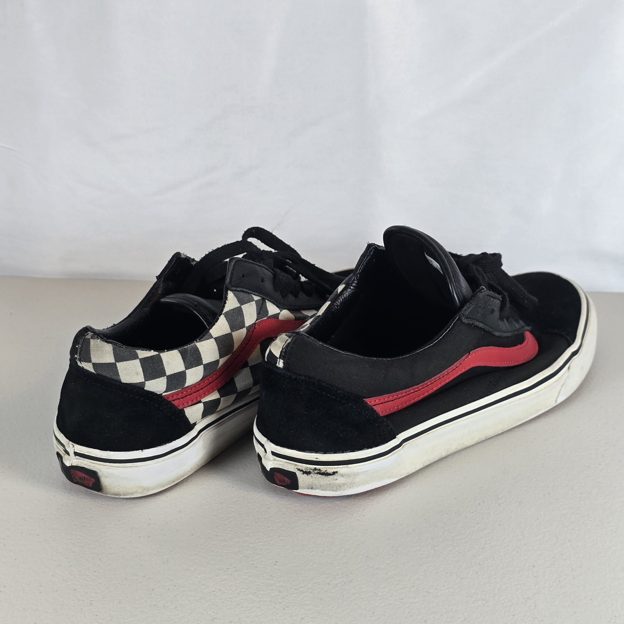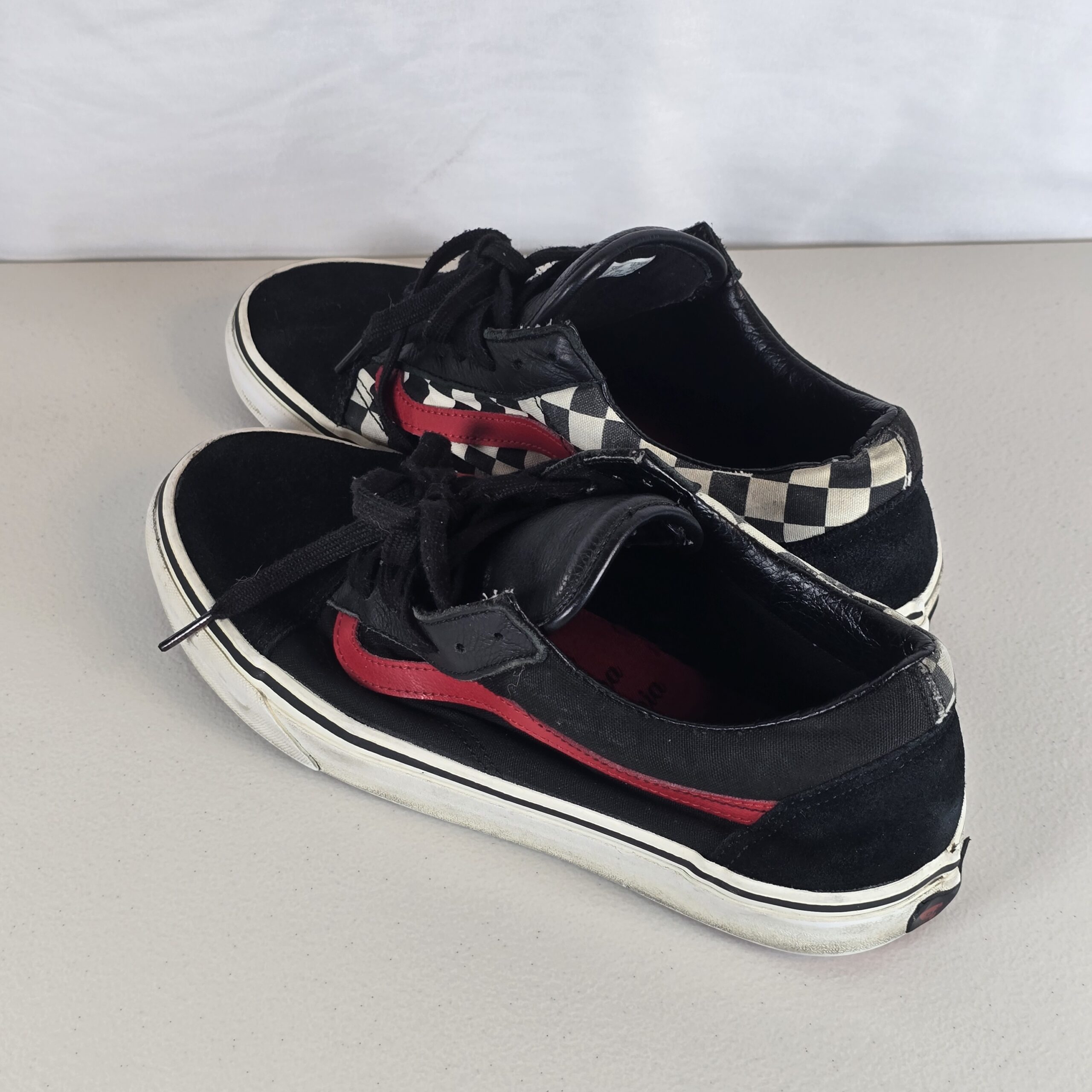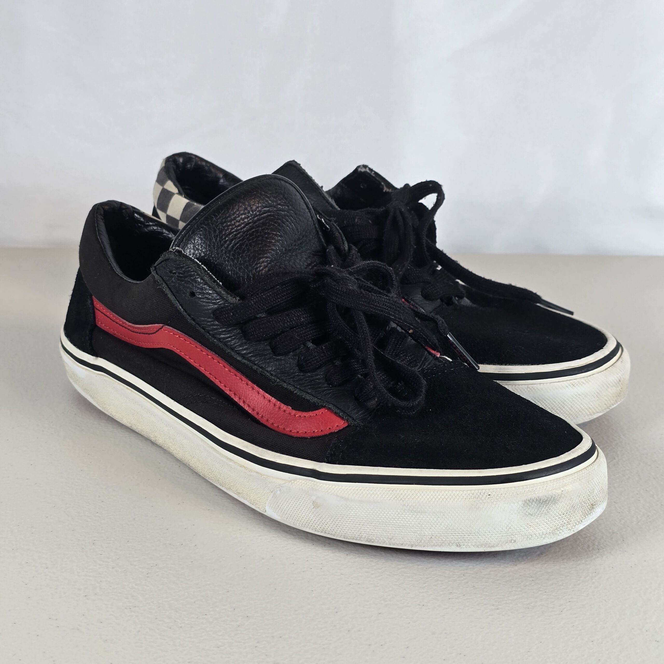 These Vans Old Skool sneakers feature a classic black suede and canvas upper with a red side stripe and checkerboard detailing around the collar. A timeless skate shoe design suitable for everyday wear.