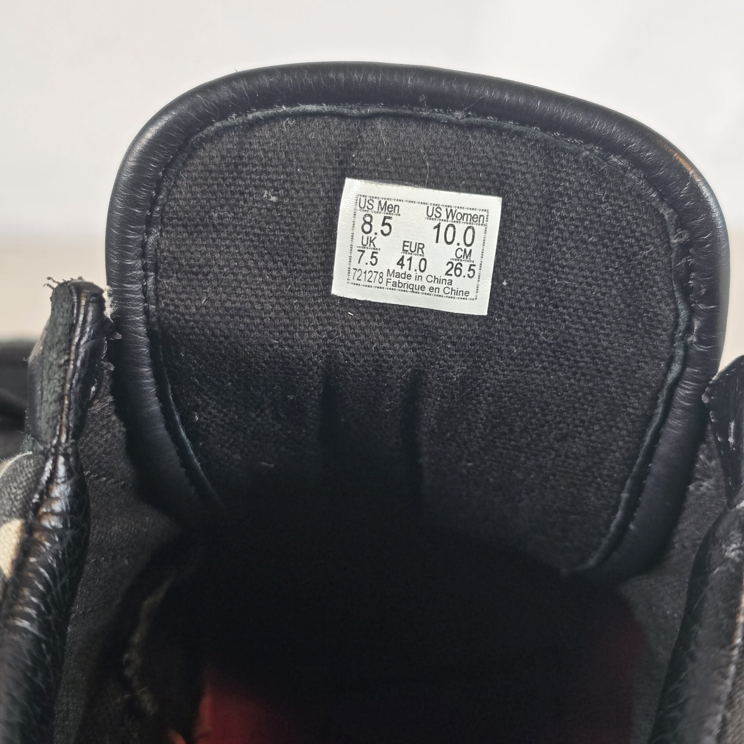This is a pre-owned item. The shoes show visible signs of wear, including creasing, scuffs, and wear on the midsoles and uppers consistent with regular use.