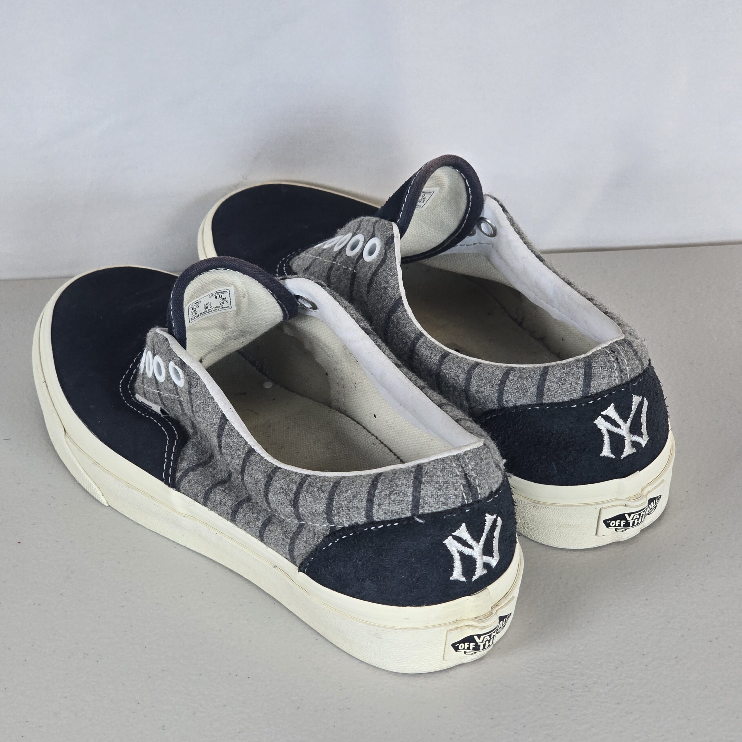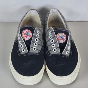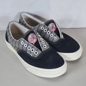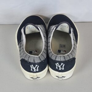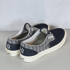 Vans low-top sneakers featuring New York Yankees (MLB) detailing with a gray pinstripe-style upper and embroidered NY logo on the heel. A clean, classic look that works well for casual wear and fan style.