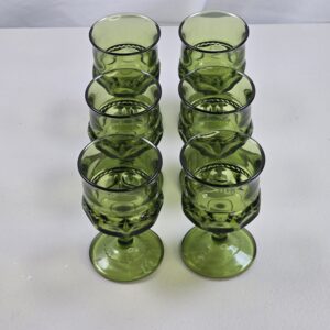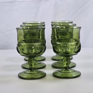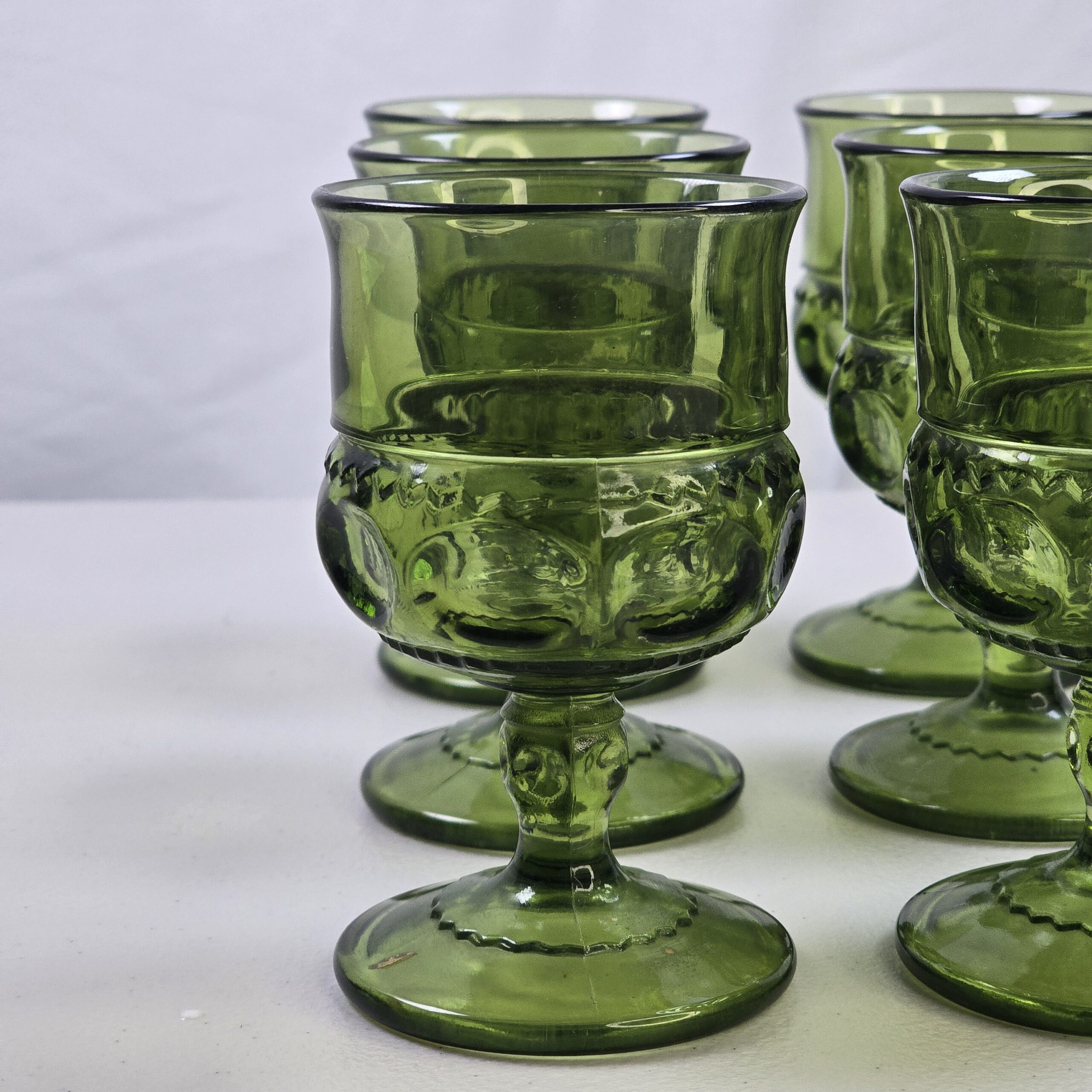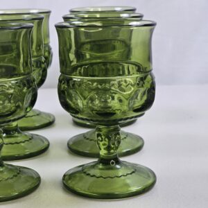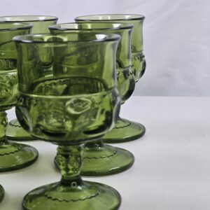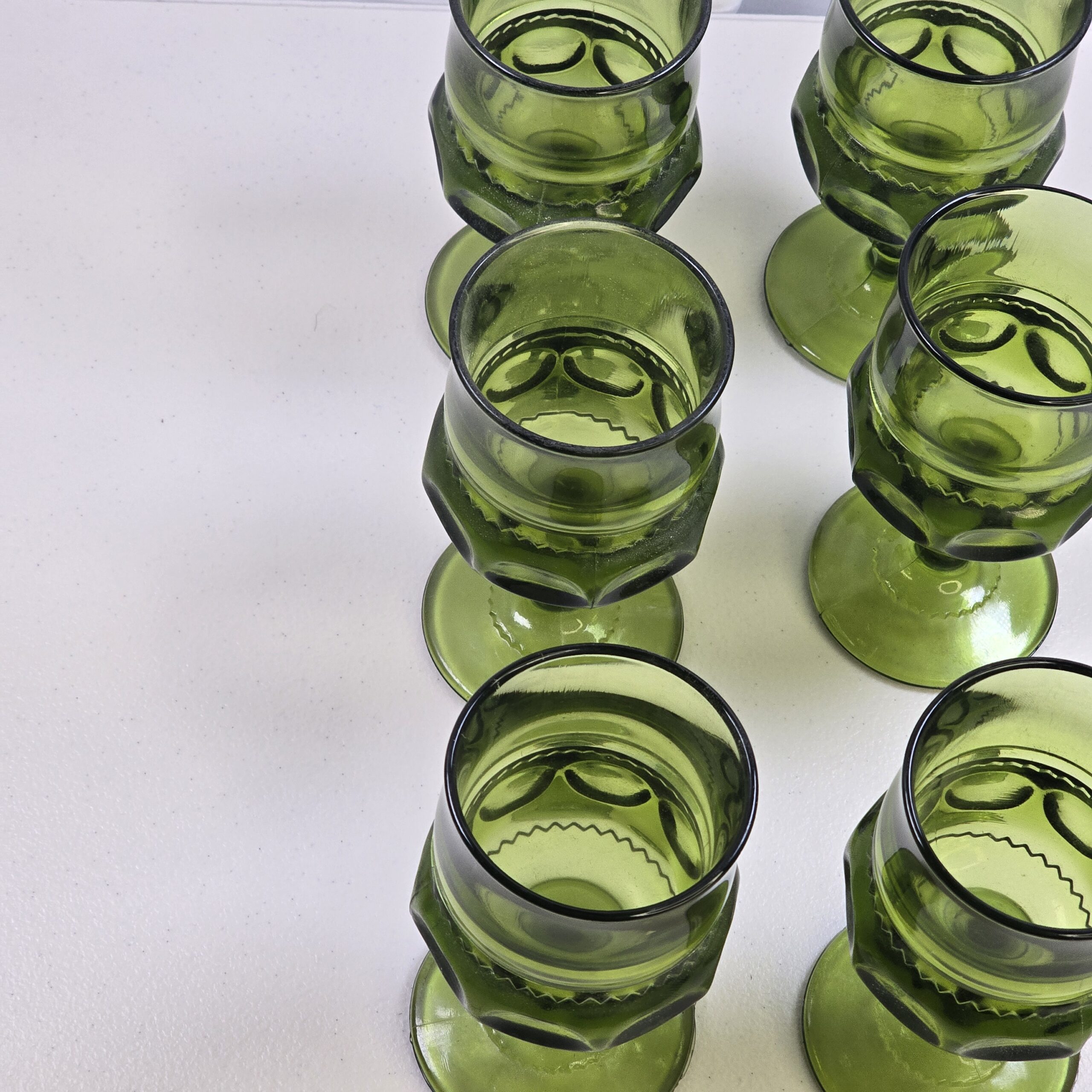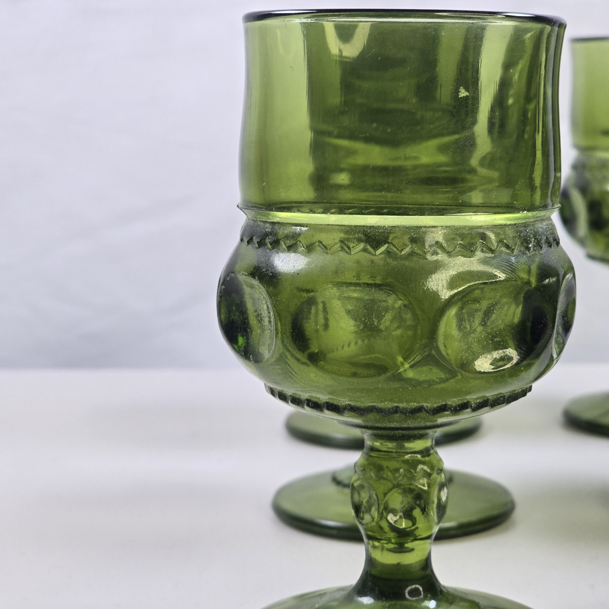 This vintage green pressed glass goblet set features a classic stemmed design with textured detailing around the bowl. The rich olive green color and molded glass pattern give these glasses a distinctive mid-century style, suitable for both everyday use and display.