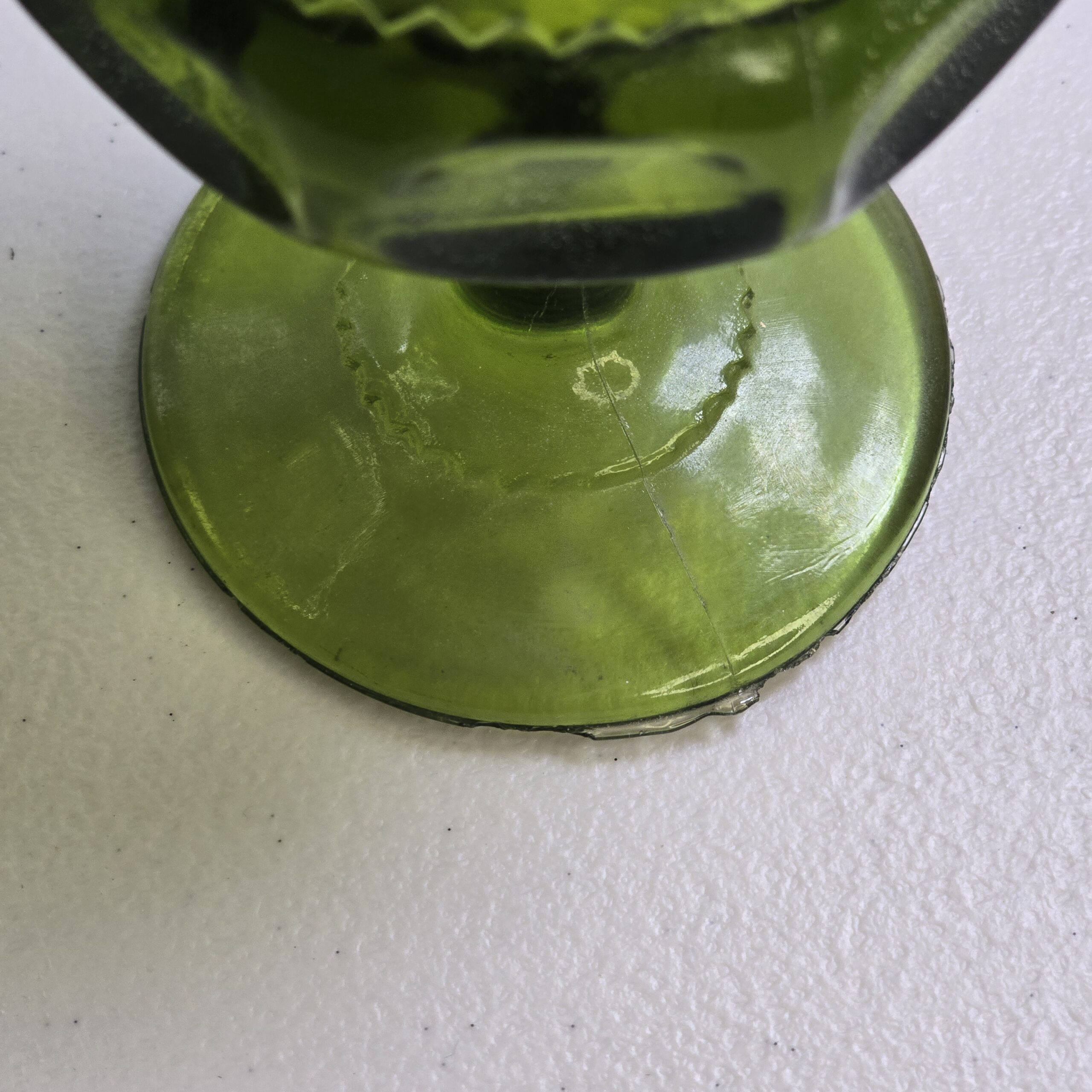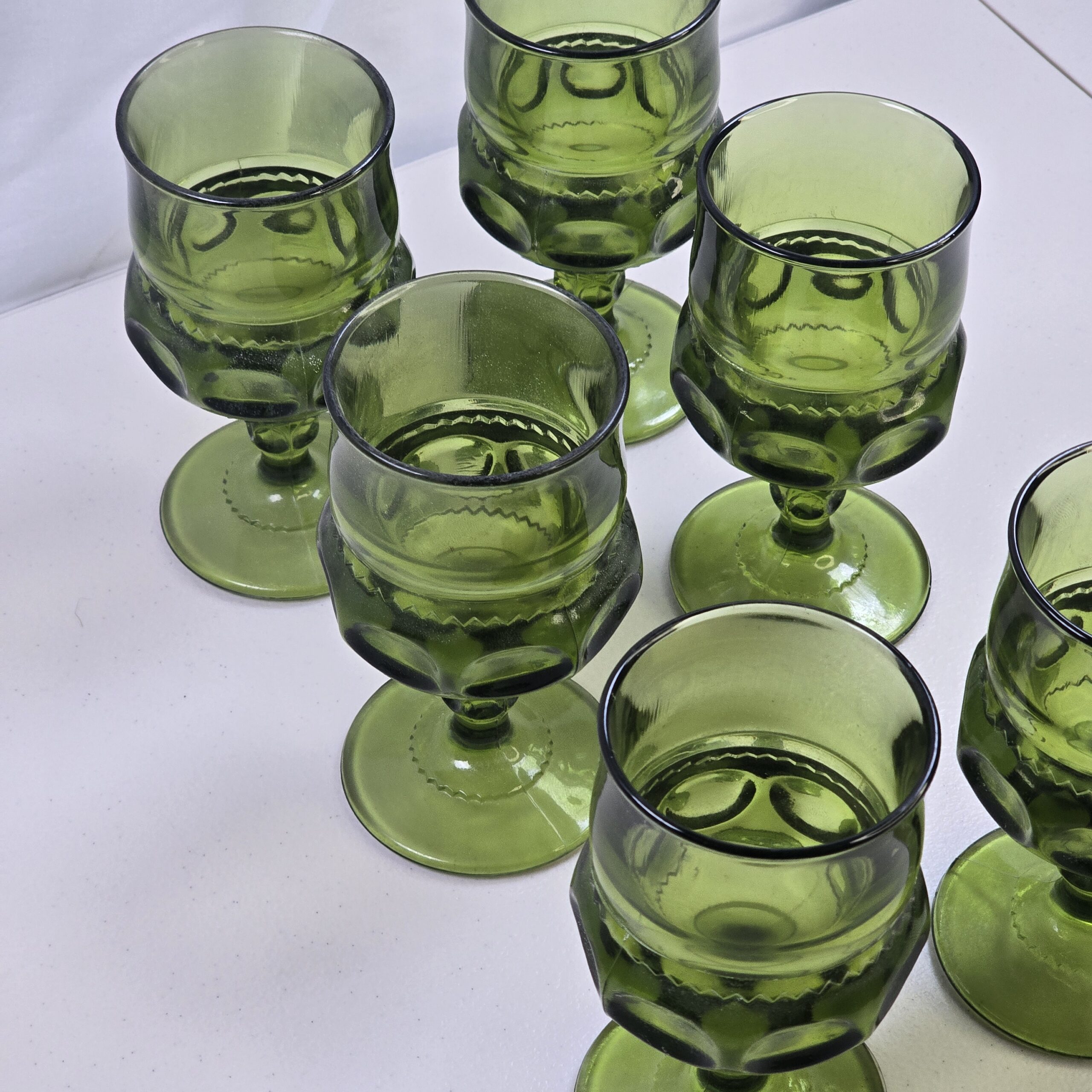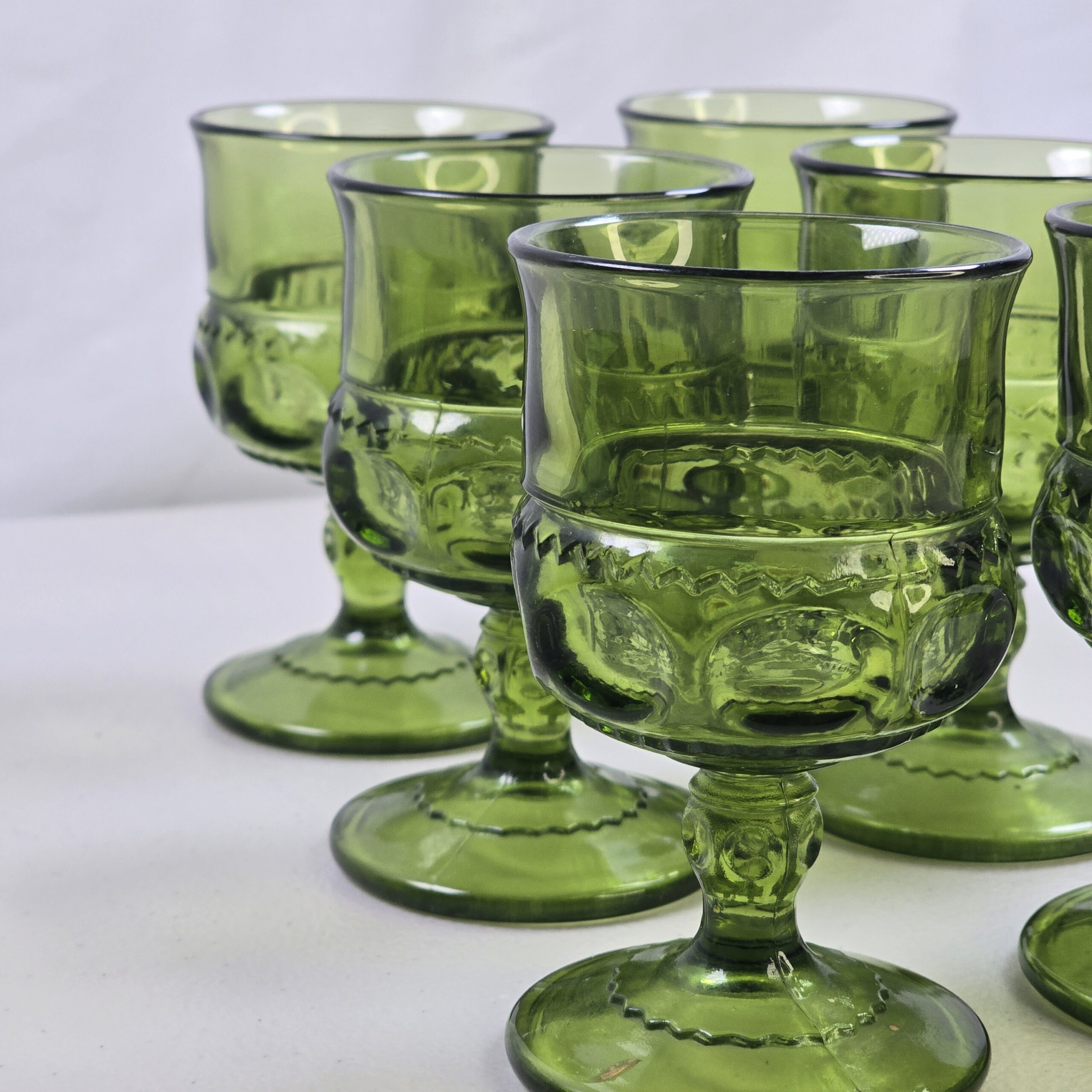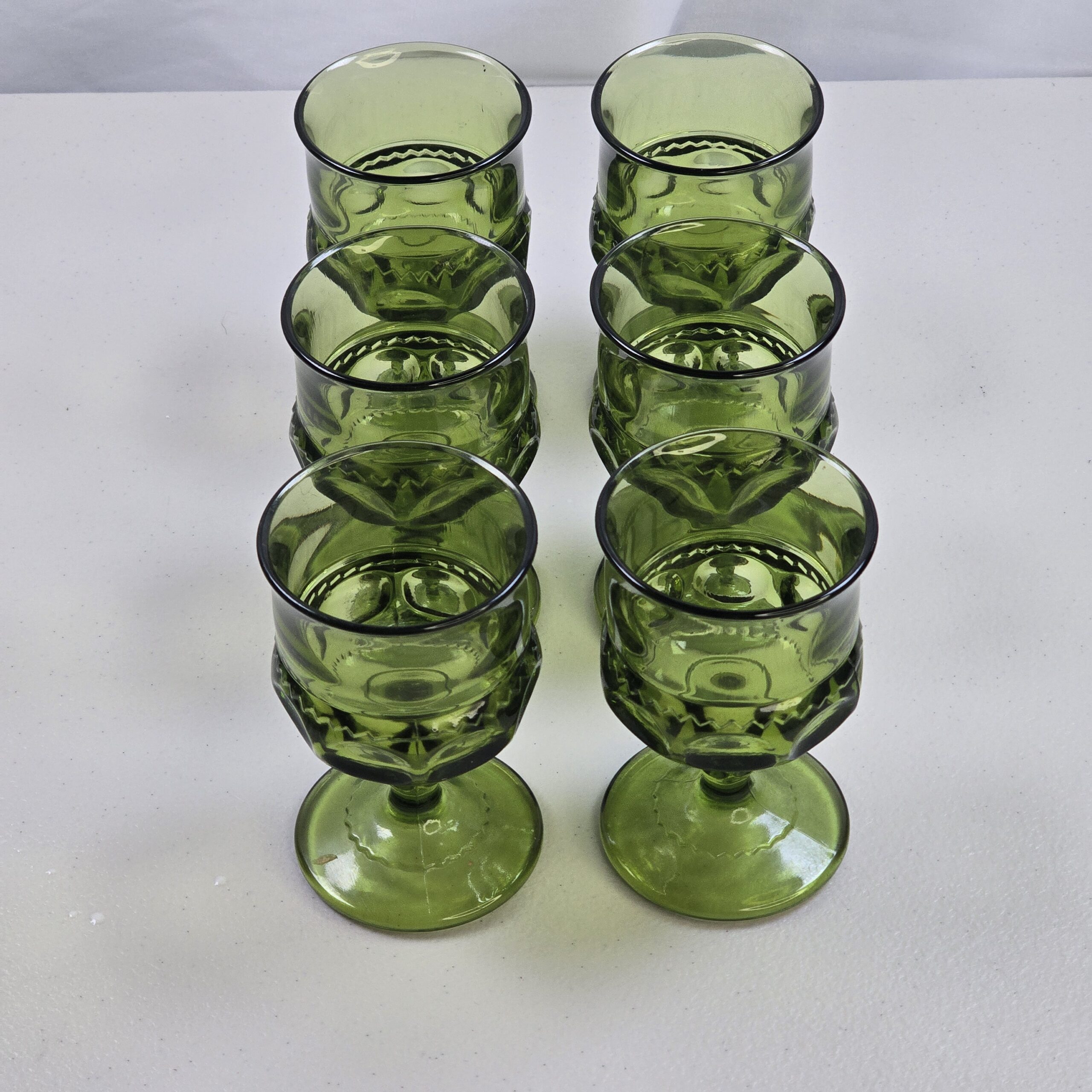 This vintage green pressed glass goblet set features a classic stemmed design with textured detailing around the bowl. The rich olive green color and molded glass pattern give these glasses a distinctive mid-century style, suitable for both everyday use and display.